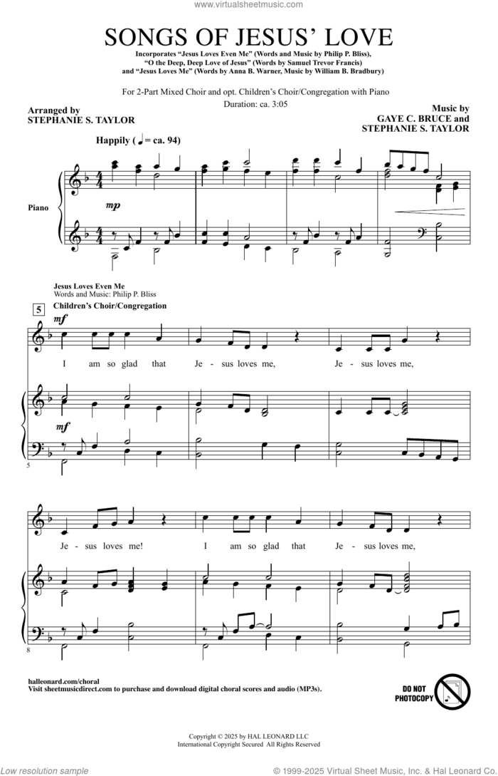 This new feature (still experimental) allows you to ask questions related to this music title to our AI music assistant (powered by OpenAI ChatGPT), trained to answer as an expert on this music title.You may ask questions like "When was this song written?" or "How would you suggest approaching this song?" You can also ask questions about the author or anything else you may think of. Just enter your queries inside the field on the top of the displayed music and click the "Ask" button on the left to start chatting. Remember that the assistant cannot perform catalog searches. It is focused only on this music title. It could also give you wrong or imperfect answers. In that case, click the "regenerate" button on the side of the answer to replace it with a new one. And, of course, you can provide feedback for each answer so we can improve the system. ![]() William B. Bradbury: Songs Of Jesus' Love for choir (2-Part Mixed), intermediate sheet music. Includes an High-Quality PDF file to download instantly. Licensed to Virtual Sheet Music® by Hal Leonard® publishing company. NOTE: The image above is just a preview of the first page of this item. Buy this item to display, print, and enjoy the complete music. Basic Score Info