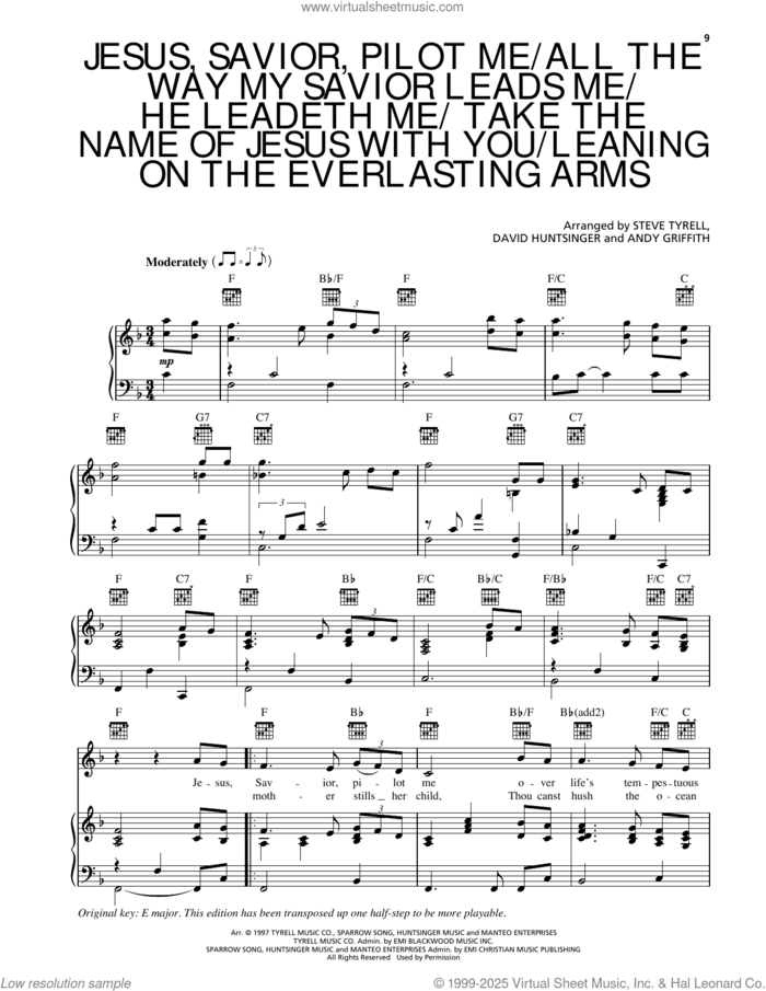 This new feature (still experimental) allows you to ask questions related to this music title to our AI music assistant (powered by OpenAI ChatGPT), trained to answer as an expert on this music title.You may ask questions like "When was this song written?" or "How would you suggest approaching this song?" You can also ask questions about the author or anything else you may think of. Just enter your queries inside the field on the top of the displayed music and click the "Ask" button on the left to start chatting. Remember that the assistant cannot perform catalog searches. It is focused only on this music title. It could also give you wrong or imperfect answers. In that case, click the "regenerate" button on the side of the answer to replace it with a new one. And, of course, you can provide feedback for each answer so we can improve the system. ![]() Andy Griffith: Jesus, Savior, Pilot Me/All The Way My Savior Leads Me/He Leadeth Me/Take The Name Of Jesus With You for voice, piano or guitar, intermediate sheet music. Includes an High-Quality PDF file to download instantly. Licensed to Virtual Sheet Music® by Hal Leonard® publishing company. NOTE: The image above is just a preview of the first page of this item. Buy this item to display, print, and enjoy the complete music. Basic Score Info