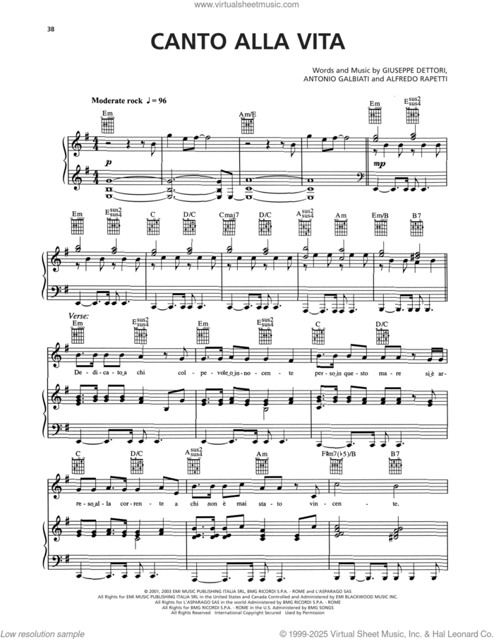 This new feature (still experimental) allows you to ask questions related to this music title to our AI music assistant (powered by OpenAI ChatGPT), trained to answer as an expert on this music title.You may ask questions like "When was this song written?" or "How would you suggest approaching this song?" You can also ask questions about the author or anything else you may think of. Just enter your queries inside the field on the top of the displayed music and click the "Ask" button on the left to start chatting. Remember that the assistant cannot perform catalog searches. It is focused only on this music title. It could also give you wrong or imperfect answers. In that case, click the "regenerate" button on the side of the answer to replace it with a new one. And, of course, you can provide feedback for each answer so we can improve the system. ![]() Josh Groban: Canto Alla Vita for voice, piano or guitar, intermediate sheet music. Includes an High-Quality PDF file to download instantly. Licensed to Virtual Sheet Music® by Hal Leonard® publishing company. NOTE: The image above is just a preview of the first page of this item. Buy this item to display, print, and enjoy the complete music. Basic Score Info
