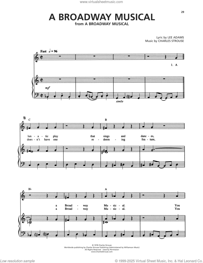 A Broadway Musical sheet music for voice and piano by Lee Adams and Charles Strouse, intermediate skill level