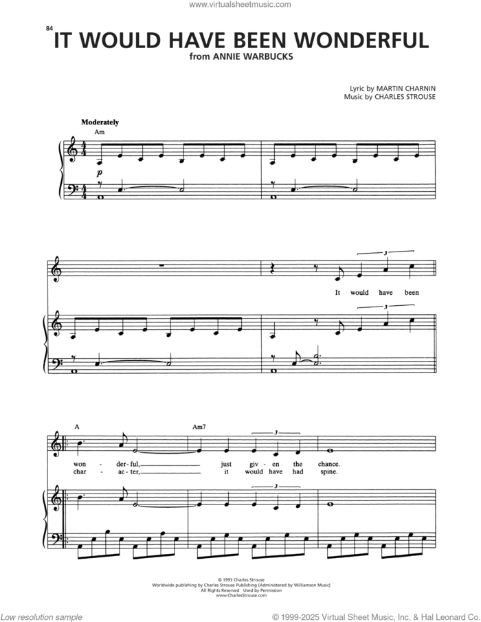 This new feature (still experimental) allows you to ask questions related to this music title to our AI music assistant (powered by OpenAI ChatGPT), trained to answer as an expert on this music title.You may ask questions like "When was this song written?" or "How would you suggest approaching this song?" You can also ask questions about the author or anything else you may think of. Just enter your queries inside the field on the top of the displayed music and click the "Ask" button on the left to start chatting. Remember that the assistant cannot perform catalog searches. It is focused only on this music title. It could also give you wrong or imperfect answers. In that case, click the "regenerate" button on the side of the answer to replace it with a new one. And, of course, you can provide feedback for each answer so we can improve the system. ![]() Charles Strouse: It Would Have Been Wonderful (from Annie Warbucks) for voice and piano, intermediate voice sheet music. Includes an High-Quality PDF file to download instantly. Licensed to Virtual Sheet Music® by Hal Leonard® publishing company. NOTE: The image above is just a preview of the first page of this item. Buy this item to display, print, and enjoy the complete music. Basic Score Info