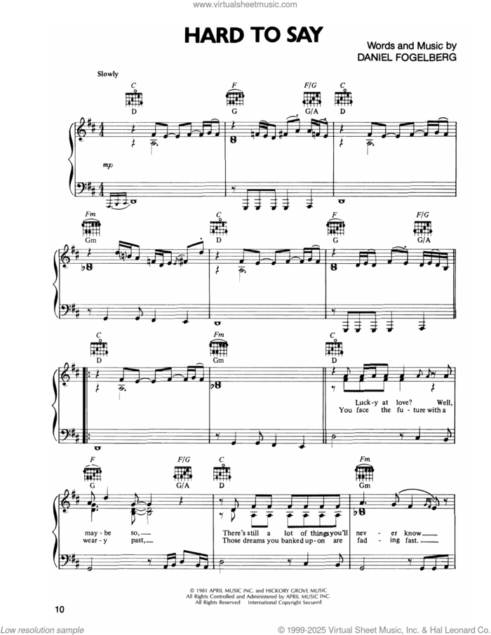 Dan Fogelberg: Hard To Say for voice, piano or guitar, intermediate sheet music. Includes an High-Quality PDF file to download instantly. Licensed to Virtual Sheet Music® by Hal Leonard® publishing company.