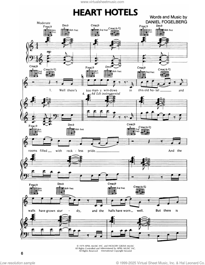 This new feature (still experimental) allows you to ask questions related to this music title to our AI music assistant (powered by OpenAI ChatGPT), trained to answer as an expert on this music title.You may ask questions like "When was this song written?" or "How would you suggest approaching this song?" You can also ask questions about the author or anything else you may think of. Just enter your queries inside the field on the top of the displayed music and click the "Ask" button on the left to start chatting. Remember that the assistant cannot perform catalog searches. It is focused only on this music title. It could also give you wrong or imperfect answers. In that case, click the "regenerate" button on the side of the answer to replace it with a new one. And, of course, you can provide feedback for each answer so we can improve the system. ![]() Dan Fogelberg: Heart Hotels for voice, piano or guitar, intermediate sheet music. Includes an High-Quality PDF file to download instantly. Licensed to Virtual Sheet Music® by Hal Leonard® publishing company. NOTE: The image above is just a preview of the first page of this item. Buy this item to display, print, and enjoy the complete music. Basic Score Info