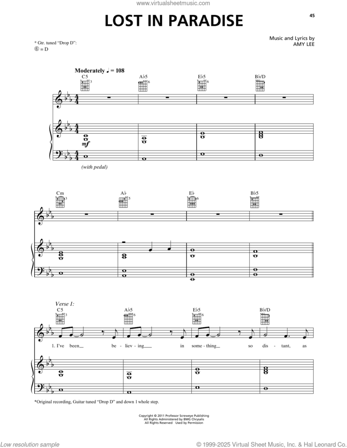 This new feature (still experimental) allows you to ask questions related to this music title to our AI music assistant (powered by OpenAI ChatGPT), trained to answer as an expert on this music title.You may ask questions like "When was this song written?" or "How would you suggest approaching this song?" You can also ask questions about the author or anything else you may think of. Just enter your queries inside the field on the top of the displayed music and click the "Ask" button on the left to start chatting. Remember that the assistant cannot perform catalog searches. It is focused only on this music title. It could also give you wrong or imperfect answers. In that case, click the "regenerate" button on the side of the answer to replace it with a new one. And, of course, you can provide feedback for each answer so we can improve the system. ![]() Evanescence: Lost In Paradise for voice, piano or guitar, intermediate sheet music. Includes an High-Quality PDF file to download instantly. Licensed to Virtual Sheet Music® by Hal Leonard® publishing company. NOTE: The image above is just a preview of the first page of this item. Buy this item to display, print, and enjoy the complete music. Basic Score Info