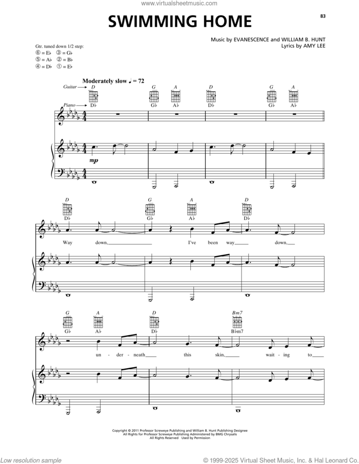 This new feature (still experimental) allows you to ask questions related to this music title to our AI music assistant (powered by OpenAI ChatGPT), trained to answer as an expert on this music title.You may ask questions like "When was this song written?" or "How would you suggest approaching this song?" You can also ask questions about the author or anything else you may think of. Just enter your queries inside the field on the top of the displayed music and click the "Ask" button on the left to start chatting. Remember that the assistant cannot perform catalog searches. It is focused only on this music title. It could also give you wrong or imperfect answers. In that case, click the "regenerate" button on the side of the answer to replace it with a new one. And, of course, you can provide feedback for each answer so we can improve the system. ![]() Evanescence: Swimming Home for voice, piano or guitar, intermediate sheet music. Includes an High-Quality PDF file to download instantly. Licensed to Virtual Sheet Music® by Hal Leonard® publishing company. NOTE: The image above is just a preview of the first page of this item. Buy this item to display, print, and enjoy the complete music. Basic Score Info