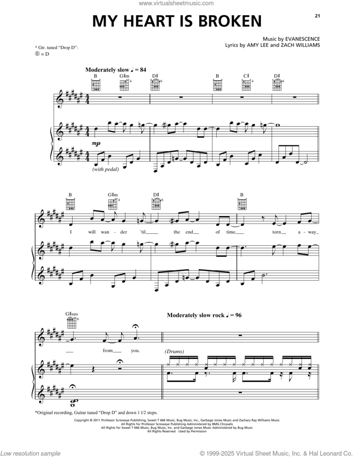 This new feature (still experimental) allows you to ask questions related to this music title to our AI music assistant (powered by OpenAI ChatGPT), trained to answer as an expert on this music title.You may ask questions like "When was this song written?" or "How would you suggest approaching this song?" You can also ask questions about the author or anything else you may think of. Just enter your queries inside the field on the top of the displayed music and click the "Ask" button on the left to start chatting. Remember that the assistant cannot perform catalog searches. It is focused only on this music title. It could also give you wrong or imperfect answers. In that case, click the "regenerate" button on the side of the answer to replace it with a new one. And, of course, you can provide feedback for each answer so we can improve the system. ![]() Evanescence: My Heart Is Broken for voice, piano or guitar, intermediate sheet music. Includes an High-Quality PDF file to download instantly. Licensed to Virtual Sheet Music® by Hal Leonard® publishing company. NOTE: The image above is just a preview of the first page of this item. Buy this item to display, print, and enjoy the complete music. Basic Score Info