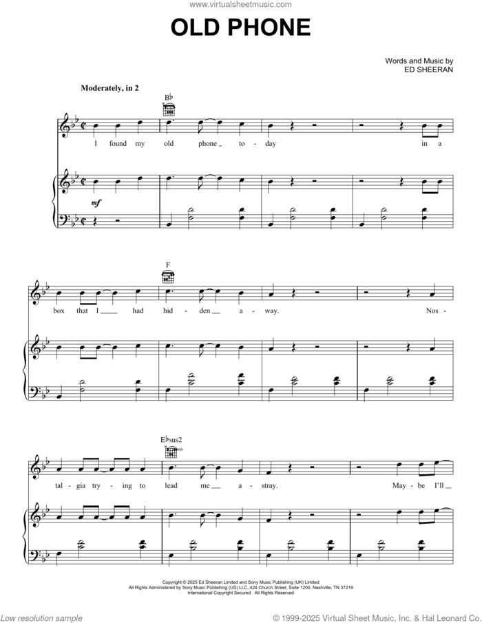 This new feature (still experimental) allows you to ask questions related to this music title to our AI music assistant (powered by OpenAI ChatGPT), trained to answer as an expert on this music title.You may ask questions like "When was this song written?" or "How would you suggest approaching this song?" You can also ask questions about the author or anything else you may think of. Just enter your queries inside the field on the top of the displayed music and click the "Ask" button on the left to start chatting. Remember that the assistant cannot perform catalog searches. It is focused only on this music title. It could also give you wrong or imperfect answers. In that case, click the "regenerate" button on the side of the answer to replace it with a new one. And, of course, you can provide feedback for each answer so we can improve the system. ![]() Ed Sheeran: Old Phone for voice, piano or guitar, intermediate sheet music. High-Quality and Interactive, transposable in any key, play along. Includes an High-Quality PDF file to download instantly. Licensed to Virtual Sheet Music® by Hal Leonard® publishing company. NOTE: The sample above is just the first page preview of this item. Buy this item to display, print, and play the complete music. Basic Score Info