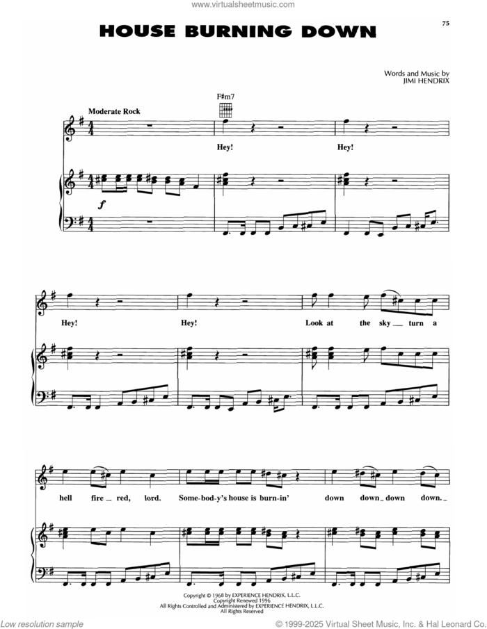 This new feature (still experimental) allows you to ask questions related to this music title to our AI music assistant (powered by OpenAI ChatGPT), trained to answer as an expert on this music title.You may ask questions like "When was this song written?" or "How would you suggest approaching this song?" You can also ask questions about the author or anything else you may think of. Just enter your queries inside the field on the top of the displayed music and click the "Ask" button on the left to start chatting. Remember that the assistant cannot perform catalog searches. It is focused only on this music title. It could also give you wrong or imperfect answers. In that case, click the "regenerate" button on the side of the answer to replace it with a new one. And, of course, you can provide feedback for each answer so we can improve the system. ![]() Jimi Hendrix: House Burning Down for voice, piano or guitar, intermediate sheet music. Includes an High-Quality PDF file to download instantly. Licensed to Virtual Sheet Music® by Hal Leonard® publishing company. NOTE: The image above is just a preview of the first page of this item. Buy this item to display, print, and enjoy the complete music. Basic Score Info