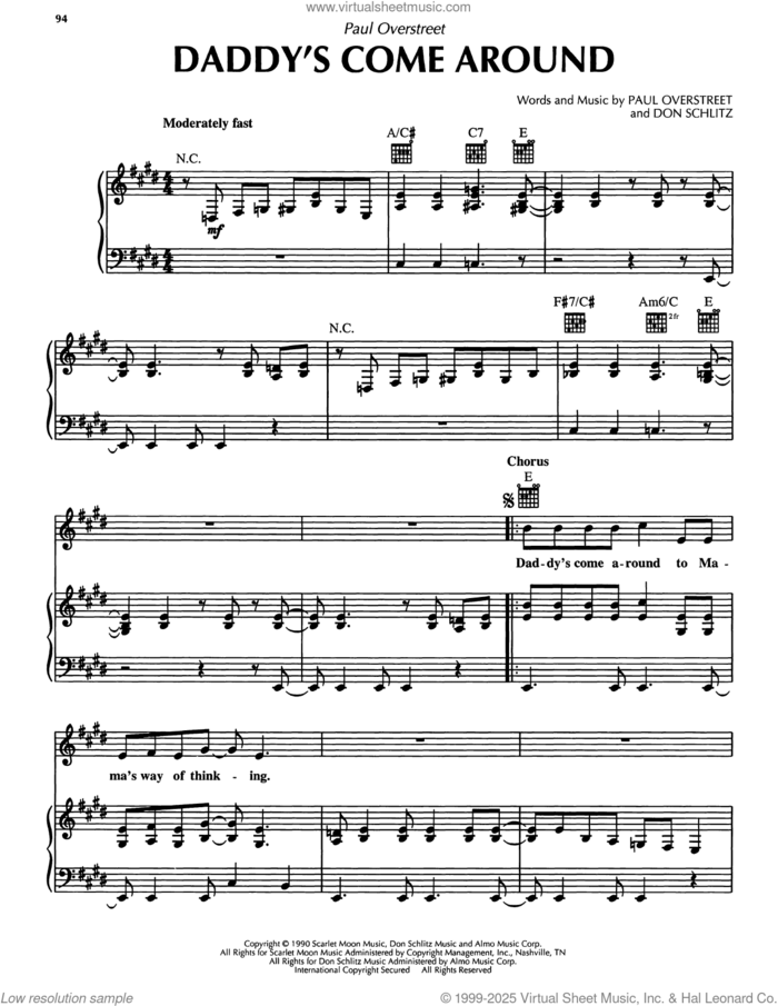 This new feature (still experimental) allows you to ask questions related to this music title to our AI music assistant (powered by OpenAI ChatGPT), trained to answer as an expert on this music title.You may ask questions like "When was this song written?" or "How would you suggest approaching this song?" You can also ask questions about the author or anything else you may think of. Just enter your queries inside the field on the top of the displayed music and click the "Ask" button on the left to start chatting. Remember that the assistant cannot perform catalog searches. It is focused only on this music title. It could also give you wrong or imperfect answers. In that case, click the "regenerate" button on the side of the answer to replace it with a new one. And, of course, you can provide feedback for each answer so we can improve the system. ![]() Paul Overstreet: Daddy's Come Around for voice, piano or guitar, intermediate sheet music. Includes an High-Quality PDF file to download instantly. Licensed to Virtual Sheet Music® by Hal Leonard® publishing company. NOTE: The image above is just a preview of the first page of this item. Buy this item to display, print, and enjoy the complete music. Basic Score Info
