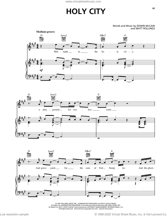 Holy City sheet music for voice, piano or guitar by Edwin McCain and Matt Rollings, intermediate skill level