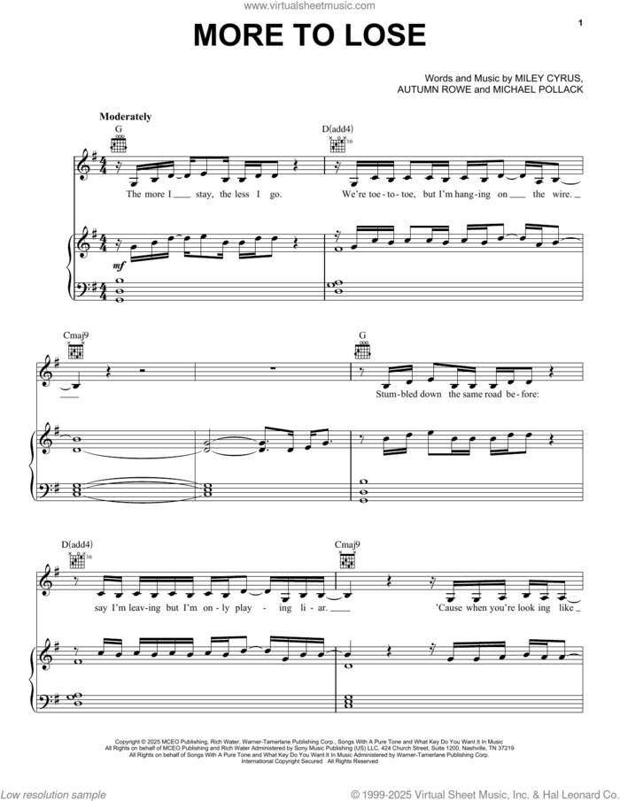 This new feature (still experimental) allows you to ask questions related to this music title to our AI music assistant (powered by OpenAI ChatGPT), trained to answer as an expert on this music title.You may ask questions like "When was this song written?" or "How would you suggest approaching this song?" You can also ask questions about the author or anything else you may think of. Just enter your queries inside the field on the top of the displayed music and click the "Ask" button on the left to start chatting. Remember that the assistant cannot perform catalog searches. It is focused only on this music title. It could also give you wrong or imperfect answers. In that case, click the "regenerate" button on the side of the answer to replace it with a new one. And, of course, you can provide feedback for each answer so we can improve the system. ![]() Miley Cyrus: More To Lose for voice, piano or guitar, intermediate sheet music. High-Quality and Interactive, transposable in any key, play along. Includes an High-Quality PDF file to download instantly. Licensed to Virtual Sheet Music® by Hal Leonard® publishing company. NOTE: The sample above is just the first page preview of this item. Buy this item to display, print, and play the complete music. Basic Score Info
