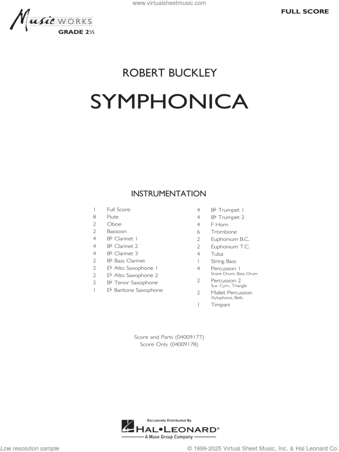 This new feature (still experimental) allows you to ask questions related to this music title to our AI music assistant (powered by OpenAI ChatGPT), trained to answer as an expert on this music title.You may ask questions like "When was this song written?" or "How would you suggest approaching this song?" You can also ask questions about the author or anything else you may think of. Just enter your queries inside the field on the top of the displayed music and click the "Ask" button on the left to start chatting. Remember that the assistant cannot perform catalog searches. It is focused only on this music title. It could also give you wrong or imperfect answers. In that case, click the "regenerate" button on the side of the answer to replace it with a new one. And, of course, you can provide feedback for each answer so we can improve the system. ![]() Robert Buckley: Symphonica (COMPLETE) for concert band, intermediate sheet music. Includes an High-Quality PDF file to download instantly. Licensed to Virtual Sheet Music® by Hal Leonard® publishing company. NOTE: The image above is just a preview of the first page of this item. Buy this item to display, print, and enjoy the complete music. Basic Score Info
