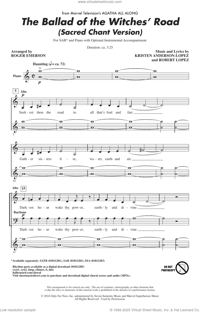 This new feature (still experimental) allows you to ask questions related to this music title to our AI music assistant (powered by OpenAI ChatGPT), trained to answer as an expert on this music title.You may ask questions like "When was this song written?" or "How would you suggest approaching this song?" You can also ask questions about the author or anything else you may think of. Just enter your queries inside the field on the top of the displayed music and click the "Ask" button on the left to start chatting. Remember that the assistant cannot perform catalog searches. It is focused only on this music title. It could also give you wrong or imperfect answers. In that case, click the "regenerate" button on the side of the answer to replace it with a new one. And, of course, you can provide feedback for each answer so we can improve the system. ![]() Robert Lopez: The Ballad Of The Witches' Road (from Agatha All Along) (arr. Roger Emerson) for choir (SAB: soprano, alto, bass), intermediate sheet music. Includes an High-Quality PDF file to download instantly. Licensed to Virtual Sheet Music® by Hal Leonard® publishing company. NOTE: The image above is just a preview of the first page of this item. Buy this item to display, print, and enjoy the complete music. Basic Score Info