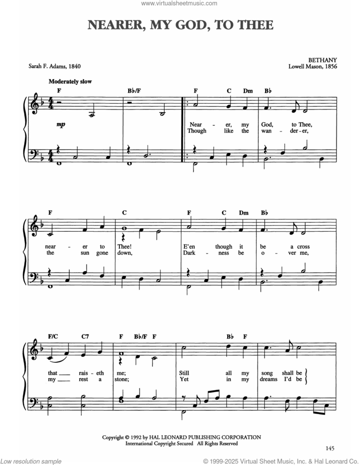 This new feature (still experimental) allows you to ask questions related to this music title to our AI music assistant (powered by OpenAI ChatGPT), trained to answer as an expert on this music title.You may ask questions like "When was this song written?" or "How would you suggest approaching this song?" You can also ask questions about the author or anything else you may think of. Just enter your queries inside the field on the top of the displayed music and click the "Ask" button on the left to start chatting. Remember that the assistant cannot perform catalog searches. It is focused only on this music title. It could also give you wrong or imperfect answers. In that case, click the "regenerate" button on the side of the answer to replace it with a new one. And, of course, you can provide feedback for each answer so we can improve the system. ![]() Sarah F. Adams: Nearer, My God, To Thee for piano solo, easy piano sheet music. Includes an High-Quality PDF file to download instantly. Licensed to Virtual Sheet Music® by Hal Leonard® publishing company. NOTE: The image above is just a preview of the first page of this item. Buy this item to display, print, and enjoy the complete music. Basic Score Info