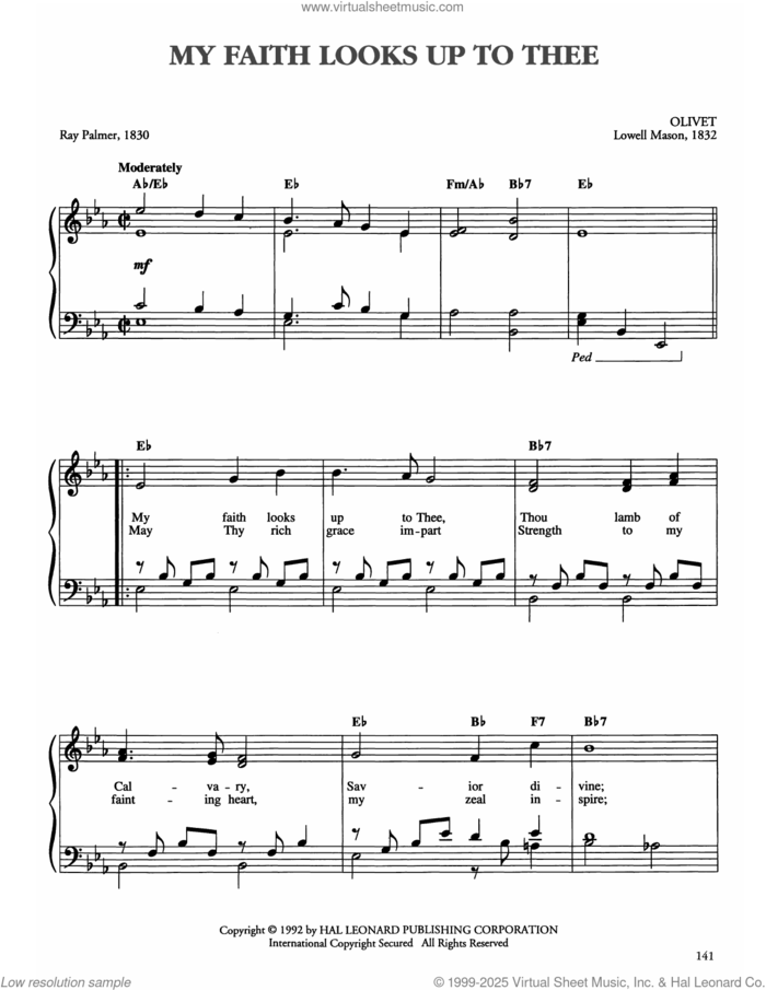This new feature (still experimental) allows you to ask questions related to this music title to our AI music assistant (powered by OpenAI ChatGPT), trained to answer as an expert on this music title.You may ask questions like "When was this song written?" or "How would you suggest approaching this song?" You can also ask questions about the author or anything else you may think of. Just enter your queries inside the field on the top of the displayed music and click the "Ask" button on the left to start chatting. Remember that the assistant cannot perform catalog searches. It is focused only on this music title. It could also give you wrong or imperfect answers. In that case, click the "regenerate" button on the side of the answer to replace it with a new one. And, of course, you can provide feedback for each answer so we can improve the system. ![]() Lowell Mason: My Faith Looks Up To Thee for piano solo, easy piano sheet music. Includes an High-Quality PDF file to download instantly. Licensed to Virtual Sheet Music® by Hal Leonard® publishing company. NOTE: The image above is just a preview of the first page of this item. Buy this item to display, print, and enjoy the complete music. Basic Score Info