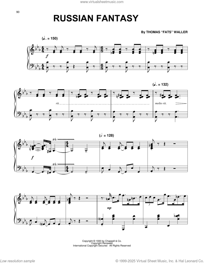 This new feature (still experimental) allows you to ask questions related to this music title to our AI music assistant (powered by OpenAI ChatGPT), trained to answer as an expert on this music title.You may ask questions like "When was this song written?" or "How would you suggest approaching this song?" You can also ask questions about the author or anything else you may think of. Just enter your queries inside the field on the top of the displayed music and click the "Ask" button on the left to start chatting. Remember that the assistant cannot perform catalog searches. It is focused only on this music title. It could also give you wrong or imperfect answers. In that case, click the "regenerate" button on the side of the answer to replace it with a new one. And, of course, you can provide feedback for each answer so we can improve the system. ![]() Fats Waller: Russian Fantasy for piano solo, intermediate piano sheet music. Includes an High-Quality PDF file to download instantly. Licensed to Virtual Sheet Music® by Hal Leonard® publishing company. NOTE: The image above is just a preview of the first page of this item. Buy this item to display, print, and enjoy the complete music. Basic Score Info