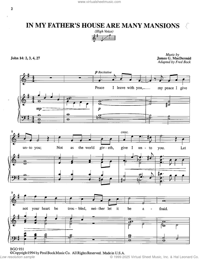 This new feature (still experimental) allows you to ask questions related to this music title to our AI music assistant (powered by OpenAI ChatGPT), trained to answer as an expert on this music title.You may ask questions like "When was this song written?" or "How would you suggest approaching this song?" You can also ask questions about the author or anything else you may think of. Just enter your queries inside the field on the top of the displayed music and click the "Ask" button on the left to start chatting. Remember that the assistant cannot perform catalog searches. It is focused only on this music title. It could also give you wrong or imperfect answers. In that case, click the "regenerate" button on the side of the answer to replace it with a new one. And, of course, you can provide feedback for each answer so we can improve the system. ![]() Fred Bock: In My Father's House Are Many Mansions for voice and piano, intermediate voice sheet music. Includes an High-Quality PDF file to download instantly. Licensed to Virtual Sheet Music® by Hal Leonard® publishing company. NOTE: The image above is just a preview of the first page of this item. Buy this item to display, print, and enjoy the complete music. Basic Score Info