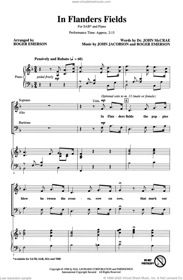 This new feature (still experimental) allows you to ask questions related to this music title to our AI music assistant (powered by OpenAI ChatGPT), trained to answer as an expert on this music title.You may ask questions like "When was this song written?" or "How would you suggest approaching this song?" You can also ask questions about the author or anything else you may think of. Just enter your queries inside the field on the top of the displayed music and click the "Ask" button on the left to start chatting. Remember that the assistant cannot perform catalog searches. It is focused only on this music title. It could also give you wrong or imperfect answers. In that case, click the "regenerate" button on the side of the answer to replace it with a new one. And, of course, you can provide feedback for each answer so we can improve the system. ![]() Roger Emerson: In Flanders Fields for choir (SAB: soprano, alto, bass), intermediate sheet music. Includes an High-Quality PDF file to download instantly. Licensed to Virtual Sheet Music® by Hal Leonard® publishing company. NOTE: The image above is just a preview of the first page of this item. Buy this item to display, print, and enjoy the complete music. Basic Score Info