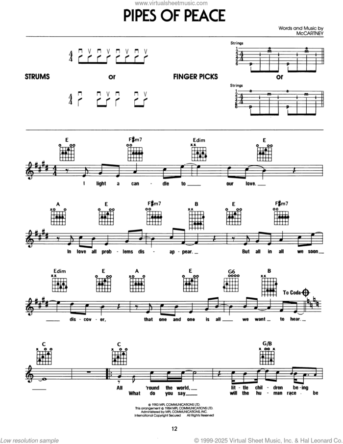 This new feature (still experimental) allows you to ask questions related to this music title to our AI music assistant (powered by OpenAI ChatGPT), trained to answer as an expert on this music title.You may ask questions like "When was this song written?" or "How would you suggest approaching this song?" You can also ask questions about the author or anything else you may think of. Just enter your queries inside the field on the top of the displayed music and click the "Ask" button on the left to start chatting. Remember that the assistant cannot perform catalog searches. It is focused only on this music title. It could also give you wrong or imperfect answers. In that case, click the "regenerate" button on the side of the answer to replace it with a new one. And, of course, you can provide feedback for each answer so we can improve the system. ![]() Paul McCartney: Pipes Of Peace for guitar solo (chords), easy guitar (chords) sheet music. Includes an High-Quality PDF file to download instantly. Licensed to Virtual Sheet Music® by Hal Leonard® publishing company. NOTE: The image above is just a preview of the first page of this item. Buy this item to display, print, and enjoy the complete music. Basic Score Info