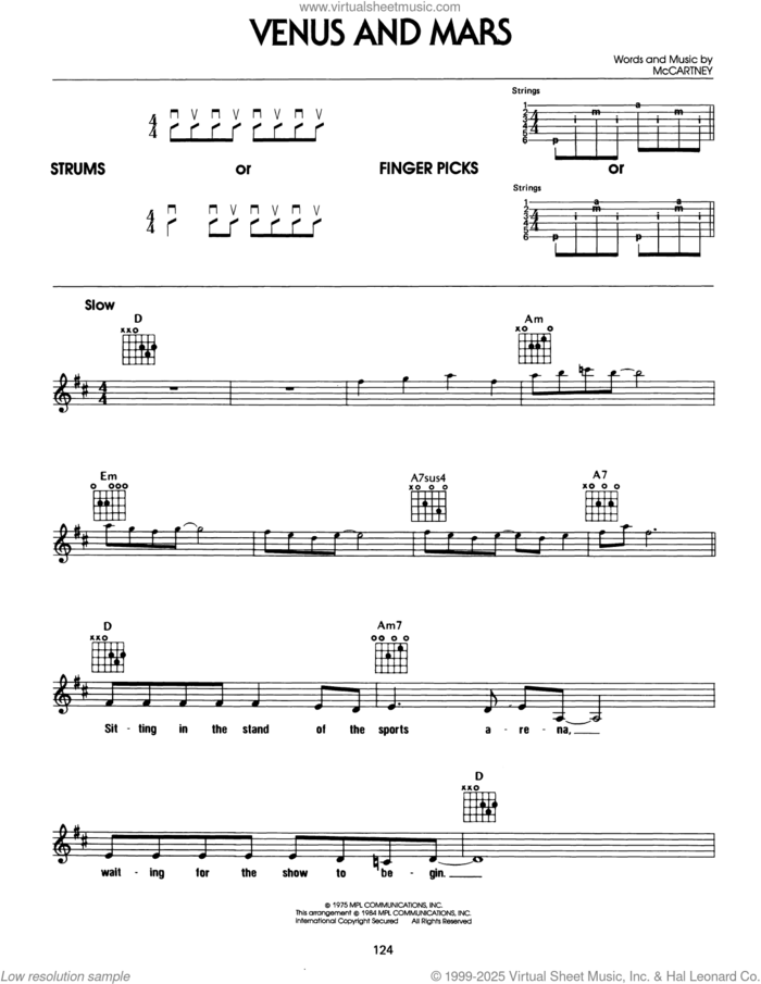This new feature (still experimental) allows you to ask questions related to this music title to our AI music assistant (powered by OpenAI ChatGPT), trained to answer as an expert on this music title.You may ask questions like "When was this song written?" or "How would you suggest approaching this song?" You can also ask questions about the author or anything else you may think of. Just enter your queries inside the field on the top of the displayed music and click the "Ask" button on the left to start chatting. Remember that the assistant cannot perform catalog searches. It is focused only on this music title. It could also give you wrong or imperfect answers. In that case, click the "regenerate" button on the side of the answer to replace it with a new one. And, of course, you can provide feedback for each answer so we can improve the system. ![]() Paul McCartney: Venus And Mars for guitar solo (chords), easy guitar (chords) sheet music. Includes an High-Quality PDF file to download instantly. Licensed to Virtual Sheet Music® by Hal Leonard® publishing company. NOTE: The image above is just a preview of the first page of this item. Buy this item to display, print, and enjoy the complete music. Basic Score Info