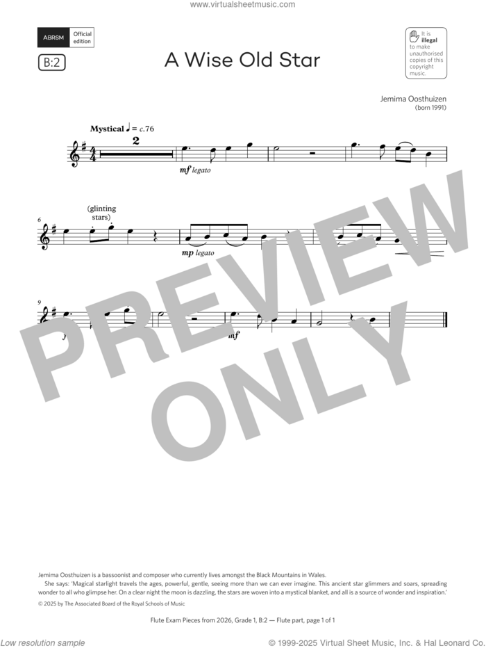 This new feature (still experimental) allows you to ask questions related to this music title to our AI music assistant (powered by OpenAI ChatGPT), trained to answer as an expert on this music title.You may ask questions like "When was this piece written?" or "How would you suggest approaching this piece?" You can also ask questions about the author or anything else you may think of. Just enter your queries inside the field on the top of the displayed music and click the "Ask" button on the left to start chatting. Remember that the assistant cannot perform catalog searches. It is focused only on this music title. It could also give you wrong or imperfect answers. In that case, click the "regenerate" button on the side of the answer to replace it with a new one. And, of course, you can provide feedback for each answer so we can improve the system. ![]() Jemima Oosthuizen: A Wise Old Star (Grade 1, list B2, from the ABRSM Flute Syllabus from 2026) for flute solo, intermediate flute sheet music. Includes an High-Quality PDF file to download instantly. Licensed to Virtual Sheet Music® by Hal Leonard® publishing company. NOTE: The image above is just a preview of the first page of this item. Buy this item to display, print, and enjoy the complete music. Basic Score Info