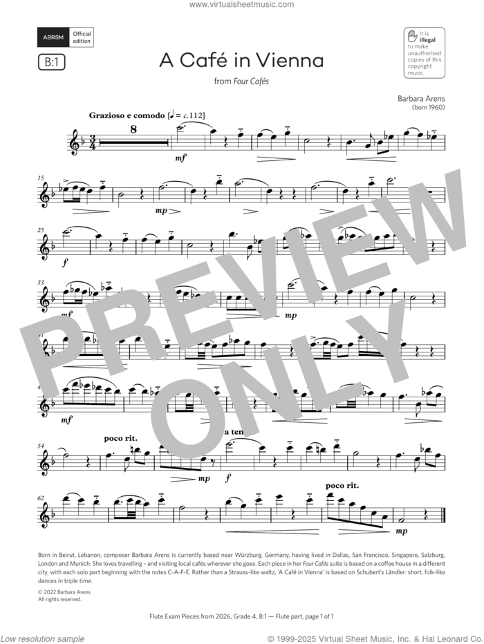 This new feature (still experimental) allows you to ask questions related to this music title to our AI music assistant (powered by OpenAI ChatGPT), trained to answer as an expert on this music title.You may ask questions like "When was this piece written?" or "How would you suggest approaching this piece?" You can also ask questions about the author or anything else you may think of. Just enter your queries inside the field on the top of the displayed music and click the "Ask" button on the left to start chatting. Remember that the assistant cannot perform catalog searches. It is focused only on this music title. It could also give you wrong or imperfect answers. In that case, click the "regenerate" button on the side of the answer to replace it with a new one. And, of course, you can provide feedback for each answer so we can improve the system. ![]() Barbara Arens: A Cafe in Vienna (Grade 4, list B1, from the ABRSM Flute Syllabus from 2026) for flute solo, intermediate flute sheet music. Includes an High-Quality PDF file to download instantly. Licensed to Virtual Sheet Music® by Hal Leonard® publishing company. NOTE: The image above is just a preview of the first page of this item. Buy this item to display, print, and enjoy the complete music. Basic Score Info