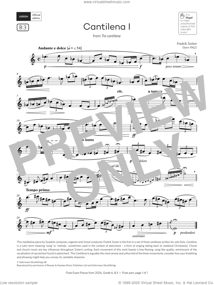 This new feature (still experimental) allows you to ask questions related to this music title to our AI music assistant (powered by OpenAI ChatGPT), trained to answer as an expert on this music title.You may ask questions like "When was this piece written?" or "How would you suggest approaching this piece?" You can also ask questions about the author or anything else you may think of. Just enter your queries inside the field on the top of the displayed music and click the "Ask" button on the left to start chatting. Remember that the assistant cannot perform catalog searches. It is focused only on this music title. It could also give you wrong or imperfect answers. In that case, click the "regenerate" button on the side of the answer to replace it with a new one. And, of course, you can provide feedback for each answer so we can improve the system. ![]() Fredrik Sixten: Cantilena I (Grade 6, list B3, from the ABRSM Flute Syllabus from 2026) for flute solo, intermediate flute sheet music. Includes an High-Quality PDF file to download instantly. Licensed to Virtual Sheet Music® by Hal Leonard® publishing company. NOTE: The image above is just a preview of the first page of this item. Buy this item to display, print, and enjoy the complete music. Basic Score Info
