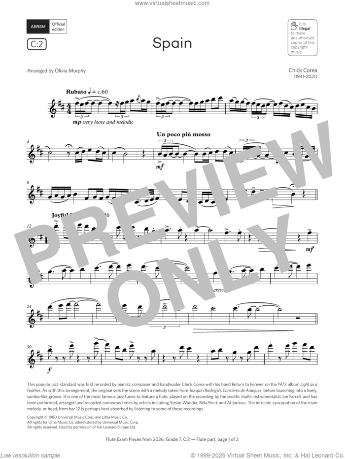 This new feature (still experimental) allows you to ask questions related to this music title to our AI music assistant (powered by OpenAI ChatGPT), trained to answer as an expert on this music title.You may ask questions like "When was this piece written?" or "How would you suggest approaching this piece?" You can also ask questions about the author or anything else you may think of. Just enter your queries inside the field on the top of the displayed music and click the "Ask" button on the left to start chatting. Remember that the assistant cannot perform catalog searches. It is focused only on this music title. It could also give you wrong or imperfect answers. In that case, click the "regenerate" button on the side of the answer to replace it with a new one. And, of course, you can provide feedback for each answer so we can improve the system. ![]() Chick Corea: Spain (Grade 7, list C2, from the ABRSM Flute Syllabus from 2026) for flute solo, intermediate flute sheet music. Includes an High-Quality PDF file to download instantly. Licensed to Virtual Sheet Music® by Hal Leonard® publishing company. NOTE: The image above is just a preview of the first page of this item. Buy this item to display, print, and enjoy the complete music. Basic Score Info