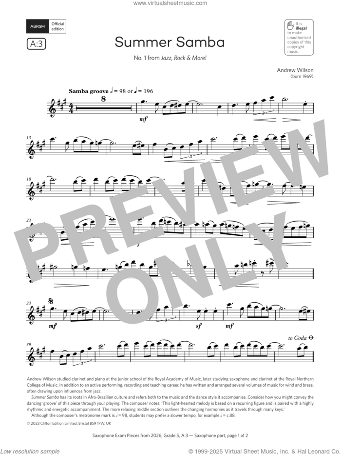 This new feature (still experimental) allows you to ask questions related to this music title to our AI music assistant (powered by OpenAI ChatGPT), trained to answer as an expert on this music title.You may ask questions like "When was this piece written?" or "How would you suggest approaching this piece?" You can also ask questions about the author or anything else you may think of. Just enter your queries inside the field on the top of the displayed music and click the "Ask" button on the left to start chatting. Remember that the assistant cannot perform catalog searches. It is focused only on this music title. It could also give you wrong or imperfect answers. In that case, click the "regenerate" button on the side of the answer to replace it with a new one. And, of course, you can provide feedback for each answer so we can improve the system. ![]() Andrew Wilson: Summer Samba (Grade 5, list A3, from the ABRSM Saxophone Syllabus from 2026) for saxophone solo, intermediate sax sheet music. Includes an High-Quality PDF file to download instantly. Licensed to Virtual Sheet Music® by Hal Leonard® publishing company. NOTE: The image above is just a preview of the first page of this item. Buy this item to display, print, and enjoy the complete music. Basic Score Info