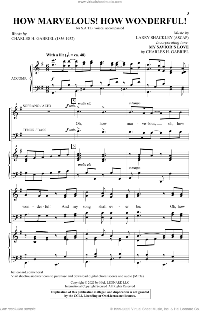This new feature (still experimental) allows you to ask questions related to this music title to our AI music assistant (powered by OpenAI ChatGPT), trained to answer as an expert on this music title.You may ask questions like "When was this song written?" or "How would you suggest approaching this song?" You can also ask questions about the author or anything else you may think of. Just enter your queries inside the field on the top of the displayed music and click the "Ask" button on the left to start chatting. Remember that the assistant cannot perform catalog searches. It is focused only on this music title. It could also give you wrong or imperfect answers. In that case, click the "regenerate" button on the side of the answer to replace it with a new one. And, of course, you can provide feedback for each answer so we can improve the system. ![]() Larry Shackley: How Marvelous! How Wonderful! for choir (SATB: soprano, alto, tenor, bass), intermediate sheet music. Includes an High-Quality PDF file to download instantly. Licensed to Virtual Sheet Music® by Hal Leonard® publishing company. NOTE: The image above is just a preview of the first page of this item. Buy this item to display, print, and enjoy the complete music. Basic Score Info