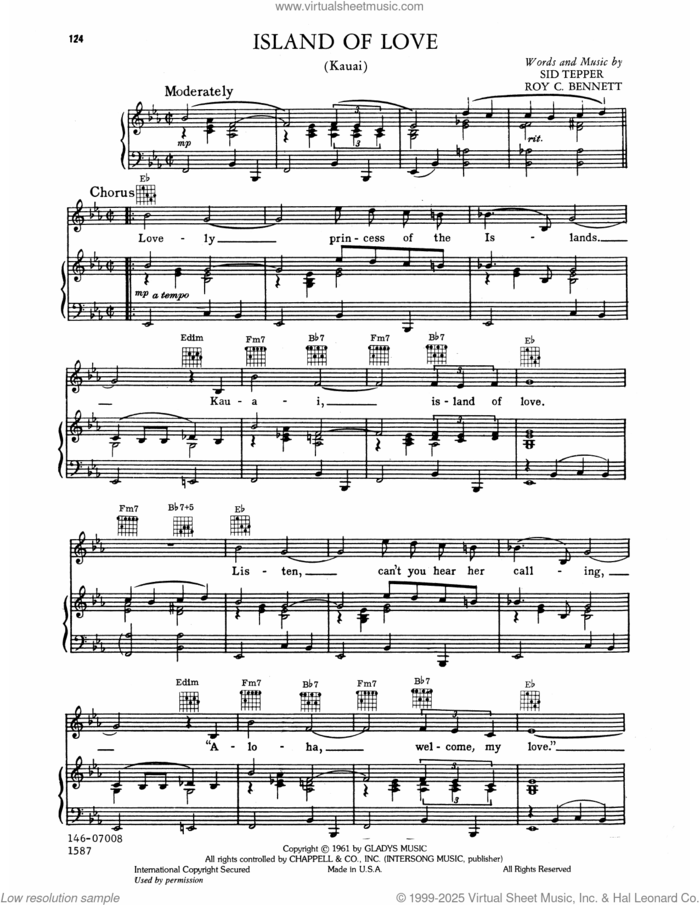 This new feature (still experimental) allows you to ask questions related to this music title to our AI music assistant (powered by OpenAI ChatGPT), trained to answer as an expert on this music title.You may ask questions like "When was this song written?" or "How would you suggest approaching this song?" You can also ask questions about the author or anything else you may think of. Just enter your queries inside the field on the top of the displayed music and click the "Ask" button on the left to start chatting. Remember that the assistant cannot perform catalog searches. It is focused only on this music title. It could also give you wrong or imperfect answers. In that case, click the "regenerate" button on the side of the answer to replace it with a new one. And, of course, you can provide feedback for each answer so we can improve the system. ![]() Elvis Presley: Island Of Love for voice, piano or guitar, intermediate sheet music. Includes an High-Quality PDF file to download instantly. Licensed to Virtual Sheet Music® by Hal Leonard® publishing company. NOTE: The image above is just a preview of the first page of this item. Buy this item to display, print, and enjoy the complete music. Basic Score Info