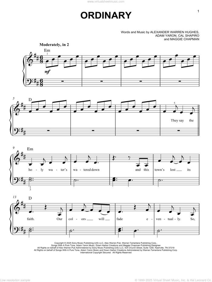 This new feature (still experimental) allows you to ask questions related to this music title to our AI music assistant (powered by OpenAI ChatGPT), trained to answer as an expert on this music title.You may ask questions like "When was this song written?" or "How would you suggest approaching this song?" You can also ask questions about the author or anything else you may think of. Just enter your queries inside the field on the top of the displayed music and click the "Ask" button on the left to start chatting. Remember that the assistant cannot perform catalog searches. It is focused only on this music title. It could also give you wrong or imperfect answers. In that case, click the "regenerate" button on the side of the answer to replace it with a new one. And, of course, you can provide feedback for each answer so we can improve the system. ![]() Alex Warren: Ordinary for piano solo, easy piano sheet music. High-Quality and Interactive, transposable in any key, play along. Includes an High-Quality PDF file to download instantly. Licensed to Virtual Sheet Music® by Hal Leonard® publishing company. NOTE: The sample above is just the first page preview of this item. Buy this item to display, print, and play the complete music. Basic Score Info