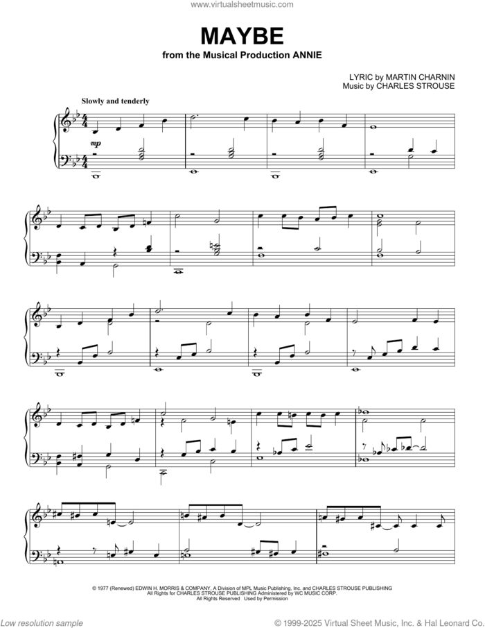 This new feature (still experimental) allows you to ask questions related to this music title to our AI music assistant (powered by OpenAI ChatGPT), trained to answer as an expert on this music title.You may ask questions like "When was this song written?" or "How would you suggest approaching this song?" You can also ask questions about the author or anything else you may think of. Just enter your queries inside the field on the top of the displayed music and click the "Ask" button on the left to start chatting. Remember that the assistant cannot perform catalog searches. It is focused only on this music title. It could also give you wrong or imperfect answers. In that case, click the "regenerate" button on the side of the answer to replace it with a new one. And, of course, you can provide feedback for each answer so we can improve the system. ![]() Charles Strouse: Maybe (from Annie) (Peaceful Piano Solo) for piano solo, intermediate piano sheet music. High-Quality and Interactive, transposable in any key, play along. Includes an High-Quality PDF file to download instantly. Licensed to Virtual Sheet Music® by Hal Leonard® publishing company. NOTE: The sample above is just the first page preview of this item. Buy this item to display, print, and play the complete music. Basic Score Info