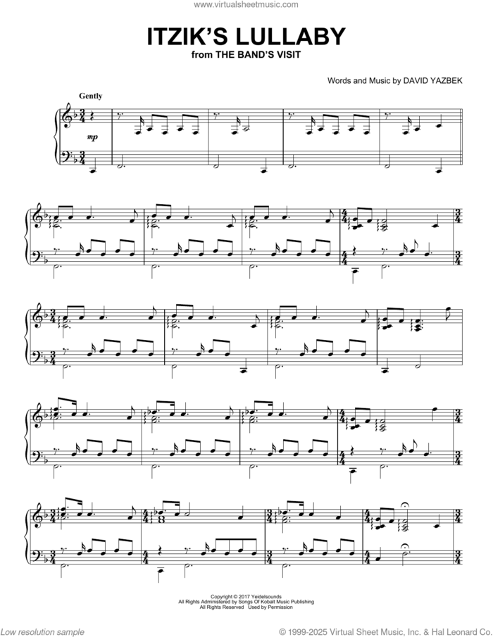 This new feature (still experimental) allows you to ask questions related to this music title to our AI music assistant (powered by OpenAI ChatGPT), trained to answer as an expert on this music title.You may ask questions like "When was this song written?" or "How would you suggest approaching this song?" You can also ask questions about the author or anything else you may think of. Just enter your queries inside the field on the top of the displayed music and click the "Ask" button on the left to start chatting. Remember that the assistant cannot perform catalog searches. It is focused only on this music title. It could also give you wrong or imperfect answers. In that case, click the "regenerate" button on the side of the answer to replace it with a new one. And, of course, you can provide feedback for each answer so we can improve the system. ![]() David Yazbek: Itzik's Lullaby (from The Band's Visit) (Peaceful Piano Solo) for piano solo, intermediate piano sheet music. High-Quality and Interactive, transposable in any key, play along. Includes an High-Quality PDF file to download instantly. Licensed to Virtual Sheet Music® by Hal Leonard® publishing company. NOTE: The sample above is just the first page preview of this item. Buy this item to display, print, and play the complete music. Basic Score Info