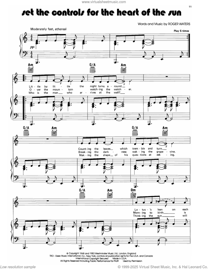 This new feature (still experimental) allows you to ask questions related to this music title to our AI music assistant (powered by OpenAI ChatGPT), trained to answer as an expert on this music title.You may ask questions like "When was this song written?" or "How would you suggest approaching this song?" You can also ask questions about the author or anything else you may think of. Just enter your queries inside the field on the top of the displayed music and click the "Ask" button on the left to start chatting. Remember that the assistant cannot perform catalog searches. It is focused only on this music title. It could also give you wrong or imperfect answers. In that case, click the "regenerate" button on the side of the answer to replace it with a new one. And, of course, you can provide feedback for each answer so we can improve the system. ![]() Pink Floyd: Set The Controls For The Heart Of The Sun for voice, piano or guitar, intermediate sheet music. Includes an High-Quality PDF file to download instantly. Licensed to Virtual Sheet Music® by Hal Leonard® publishing company. NOTE: The image above is just a preview of the first page of this item. Buy this item to display, print, and enjoy the complete music. Basic Score Info
