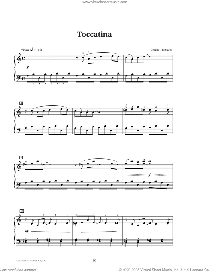 This new feature (still experimental) allows you to ask questions related to this music title to our AI music assistant (powered by OpenAI ChatGPT), trained to answer as an expert on this music title.You may ask questions like "When was this song written?" or "How would you suggest approaching this song?" You can also ask questions about the author or anything else you may think of. Just enter your queries inside the field on the top of the displayed music and click the "Ask" button on the left to start chatting. Remember that the assistant cannot perform catalog searches. It is focused only on this music title. It could also give you wrong or imperfect answers. In that case, click the "regenerate" button on the side of the answer to replace it with a new one. And, of course, you can provide feedback for each answer so we can improve the system. ![]() Christos Tsitsaros: Toccatina for piano solo (elementary), beginner piano (elementary) sheet music. Includes an High-Quality PDF file to download instantly. Licensed to Virtual Sheet Music® by Hal Leonard® publishing company. NOTE: The image above is just a preview of the first page of this item. Buy this item to display, print, and enjoy the complete music. Basic Score Info