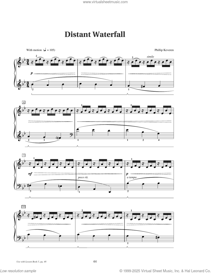 This new feature (still experimental) allows you to ask questions related to this music title to our AI music assistant (powered by OpenAI ChatGPT), trained to answer as an expert on this music title.You may ask questions like "When was this song written?" or "How would you suggest approaching this song?" You can also ask questions about the author or anything else you may think of. Just enter your queries inside the field on the top of the displayed music and click the "Ask" button on the left to start chatting. Remember that the assistant cannot perform catalog searches. It is focused only on this music title. It could also give you wrong or imperfect answers. In that case, click the "regenerate" button on the side of the answer to replace it with a new one. And, of course, you can provide feedback for each answer so we can improve the system. ![]() Phillip Keveren: Distant Waterfall for piano solo (elementary), beginner piano (elementary) sheet music. Includes an High-Quality PDF file to download instantly. Licensed to Virtual Sheet Music® by Hal Leonard® publishing company. NOTE: The image above is just a preview of the first page of this item. Buy this item to display, print, and enjoy the complete music. Basic Score Info