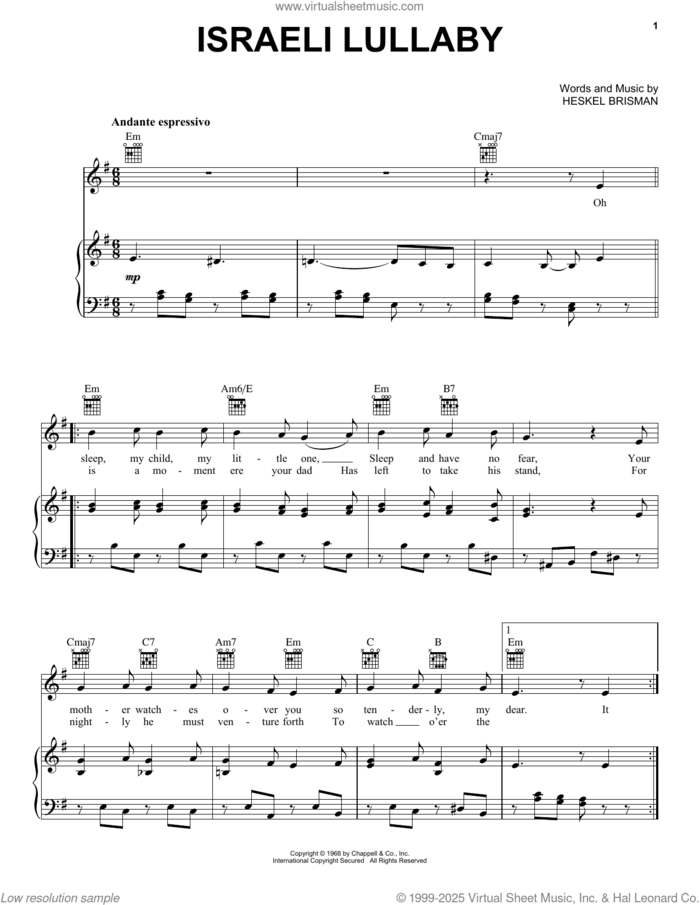 This new feature (still experimental) allows you to ask questions related to this music title to our AI music assistant (powered by OpenAI ChatGPT), trained to answer as an expert on this music title.You may ask questions like "When was this song written?" or "How would you suggest approaching this song?" You can also ask questions about the author or anything else you may think of. Just enter your queries inside the field on the top of the displayed music and click the "Ask" button on the left to start chatting. Remember that the assistant cannot perform catalog searches. It is focused only on this music title. It could also give you wrong or imperfect answers. In that case, click the "regenerate" button on the side of the answer to replace it with a new one. And, of course, you can provide feedback for each answer so we can improve the system. ![]() Heskel Brisman: Israeli Lullaby for voice, piano or guitar, intermediate sheet music. High-Quality and Interactive, transposable in any key, play along. Includes an High-Quality PDF file to download instantly. Licensed to Virtual Sheet Music® by Hal Leonard® publishing company. NOTE: The sample above is just the first page preview of this item. Buy this item to display, print, and play the complete music. Basic Score Info