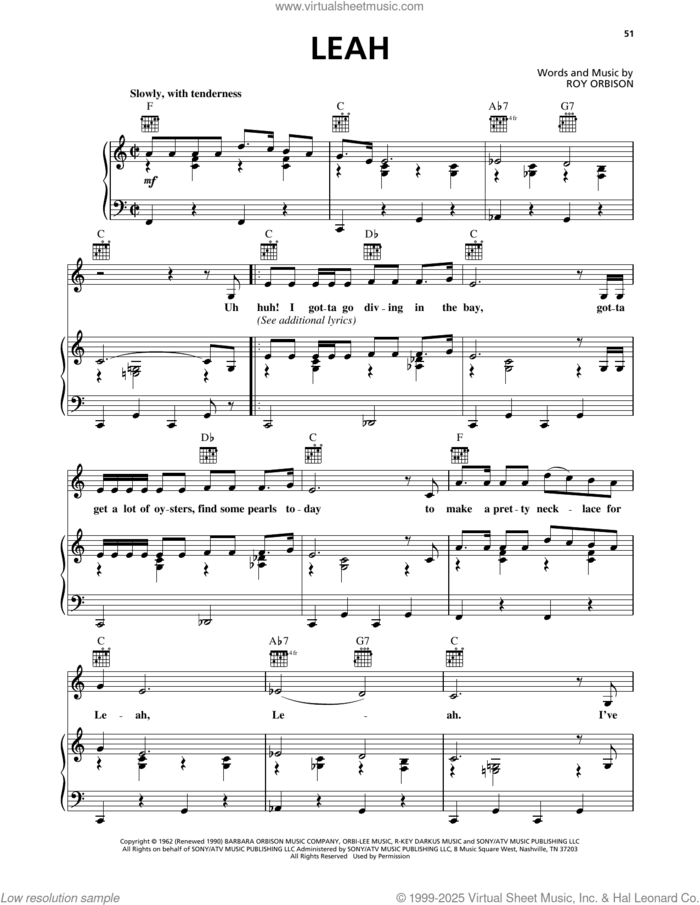This new feature (still experimental) allows you to ask questions related to this music title to our AI music assistant (powered by OpenAI ChatGPT), trained to answer as an expert on this music title.You may ask questions like "When was this song written?" or "How would you suggest approaching this song?" You can also ask questions about the author or anything else you may think of. Just enter your queries inside the field on the top of the displayed music and click the "Ask" button on the left to start chatting. Remember that the assistant cannot perform catalog searches. It is focused only on this music title. It could also give you wrong or imperfect answers. In that case, click the "regenerate" button on the side of the answer to replace it with a new one. And, of course, you can provide feedback for each answer so we can improve the system. ![]() Roy Orbison: Leah for voice, piano or guitar, intermediate sheet music. Includes an High-Quality PDF file to download instantly. Licensed to Virtual Sheet Music® by Hal Leonard® publishing company. NOTE: The image above is just a preview of the first page of this item. Buy this item to display, print, and enjoy the complete music. Basic Score Info