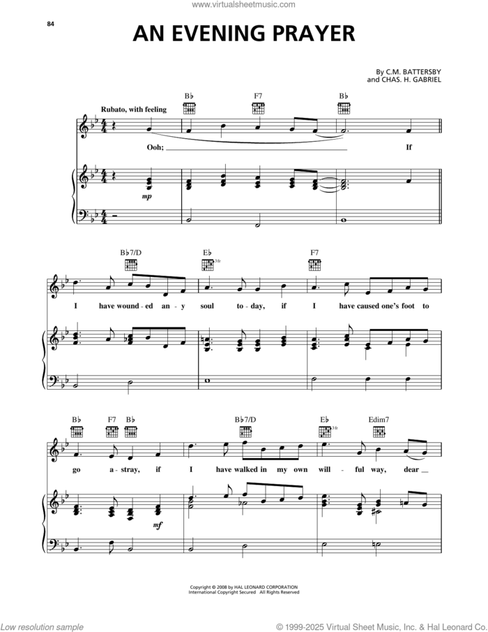 This new feature (still experimental) allows you to ask questions related to this music title to our AI music assistant (powered by OpenAI ChatGPT), trained to answer as an expert on this music title.You may ask questions like "When was this song written?" or "How would you suggest approaching this song?" You can also ask questions about the author or anything else you may think of. Just enter your queries inside the field on the top of the displayed music and click the "Ask" button on the left to start chatting. Remember that the assistant cannot perform catalog searches. It is focused only on this music title. It could also give you wrong or imperfect answers. In that case, click the "regenerate" button on the side of the answer to replace it with a new one. And, of course, you can provide feedback for each answer so we can improve the system. ![]() Elvis Presley: An Evening Prayer for voice, piano or guitar, intermediate sheet music. Includes an High-Quality PDF file to download instantly. Licensed to Virtual Sheet Music® by Hal Leonard® publishing company. NOTE: The image above is just a preview of the first page of this item. Buy this item to display, print, and enjoy the complete music. Basic Score Info