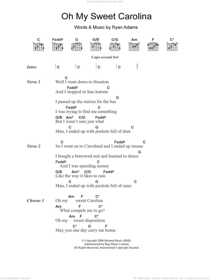 This new feature (still experimental) allows you to ask questions related to this music title to our AI music assistant (powered by OpenAI ChatGPT), trained to answer as an expert on this music title.You may ask questions like "When was this song written?" or "How would you suggest approaching this song?" You can also ask questions about the author or anything else you may think of. Just enter your queries inside the field on the top of the displayed music and click the "Ask" button on the left to start chatting. Remember that the assistant cannot perform catalog searches. It is focused only on this music title. It could also give you wrong or imperfect answers. In that case, click the "regenerate" button on the side of the answer to replace it with a new one. And, of course, you can provide feedback for each answer so we can improve the system. ![]() Ryan Adams: Oh My Sweet Carolina for guitar (chords), intermediate sheet music. Includes an High-Quality PDF file to download instantly. Licensed to Virtual Sheet Music® by Hal Leonard® publishing company. NOTE: The image above is just a preview of the first page of this item. Buy this item to display, print, and enjoy the complete music. Basic Score Info
