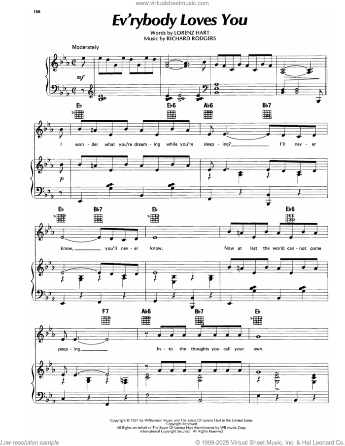 This new feature (still experimental) allows you to ask questions related to this music title to our AI music assistant (powered by OpenAI ChatGPT), trained to answer as an expert on this music title.You may ask questions like "When was this song written?" or "How would you suggest approaching this song?" You can also ask questions about the author or anything else you may think of. Just enter your queries inside the field on the top of the displayed music and click the "Ask" button on the left to start chatting. Remember that the assistant cannot perform catalog searches. It is focused only on this music title. It could also give you wrong or imperfect answers. In that case, click the "regenerate" button on the side of the answer to replace it with a new one. And, of course, you can provide feedback for each answer so we can improve the system. ![]() Richard Rodgers: Everybody Loves You (from I'd Rather Be Right) for voice, piano or guitar, intermediate sheet music. Includes an High-Quality PDF file to download instantly. Licensed to Virtual Sheet Music® by Hal Leonard® publishing company. NOTE: The image above is just a preview of the first page of this item. Buy this item to display, print, and enjoy the complete music. Basic Score Info
