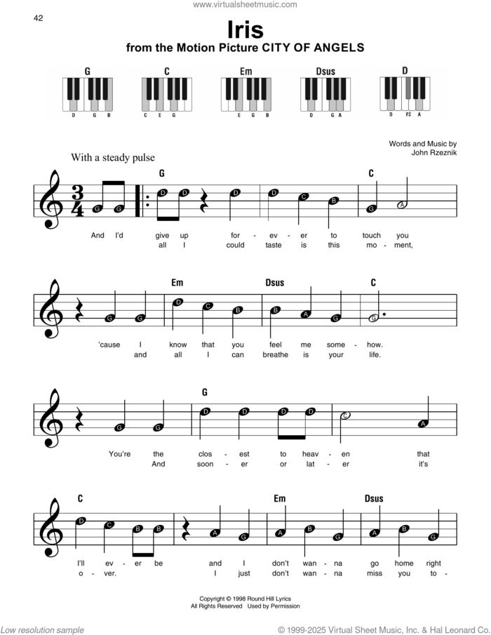 This new feature (still experimental) allows you to ask questions related to this music title to our AI music assistant (powered by OpenAI ChatGPT), trained to answer as an expert on this music title.You may ask questions like "When was this song written?" or "How would you suggest approaching this song?" You can also ask questions about the author or anything else you may think of. Just enter your queries inside the field on the top of the displayed music and click the "Ask" button on the left to start chatting. Remember that the assistant cannot perform catalog searches. It is focused only on this music title. It could also give you wrong or imperfect answers. In that case, click the "regenerate" button on the side of the answer to replace it with a new one. And, of course, you can provide feedback for each answer so we can improve the system. ![]() Goo Goo Dolls: Iris for piano solo, beginner piano sheet music. Includes an High-Quality PDF file to download instantly. Licensed to Virtual Sheet Music® by Hal Leonard® publishing company. NOTE: The image above is just a preview of the first page of this item. Buy this item to display, print, and enjoy the complete music. Basic Score Info