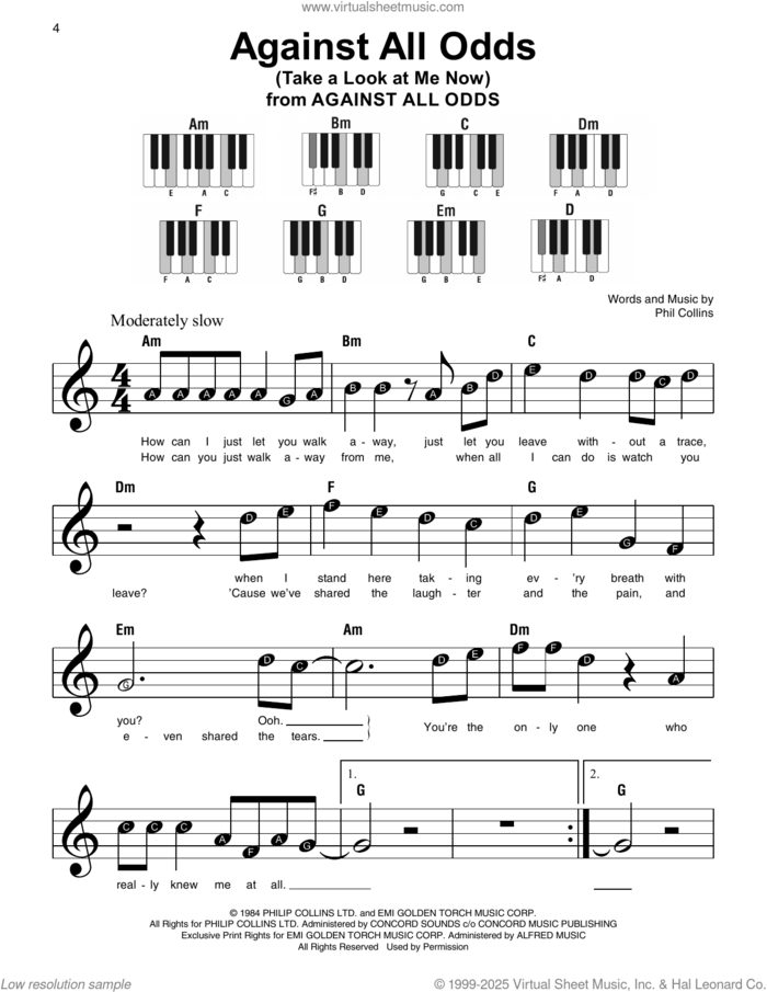 This new feature (still experimental) allows you to ask questions related to this music title to our AI music assistant (powered by OpenAI ChatGPT), trained to answer as an expert on this music title.You may ask questions like "When was this song written?" or "How would you suggest approaching this song?" You can also ask questions about the author or anything else you may think of. Just enter your queries inside the field on the top of the displayed music and click the "Ask" button on the left to start chatting. Remember that the assistant cannot perform catalog searches. It is focused only on this music title. It could also give you wrong or imperfect answers. In that case, click the "regenerate" button on the side of the answer to replace it with a new one. And, of course, you can provide feedback for each answer so we can improve the system. ![]() Phil Collins: Against All Odds (Take A Look At Me Now) for piano solo, beginner piano sheet music. Includes an High-Quality PDF file to download instantly. Licensed to Virtual Sheet Music® by Hal Leonard® publishing company. NOTE: The image above is just a preview of the first page of this item. Buy this item to display, print, and enjoy the complete music. Basic Score Info