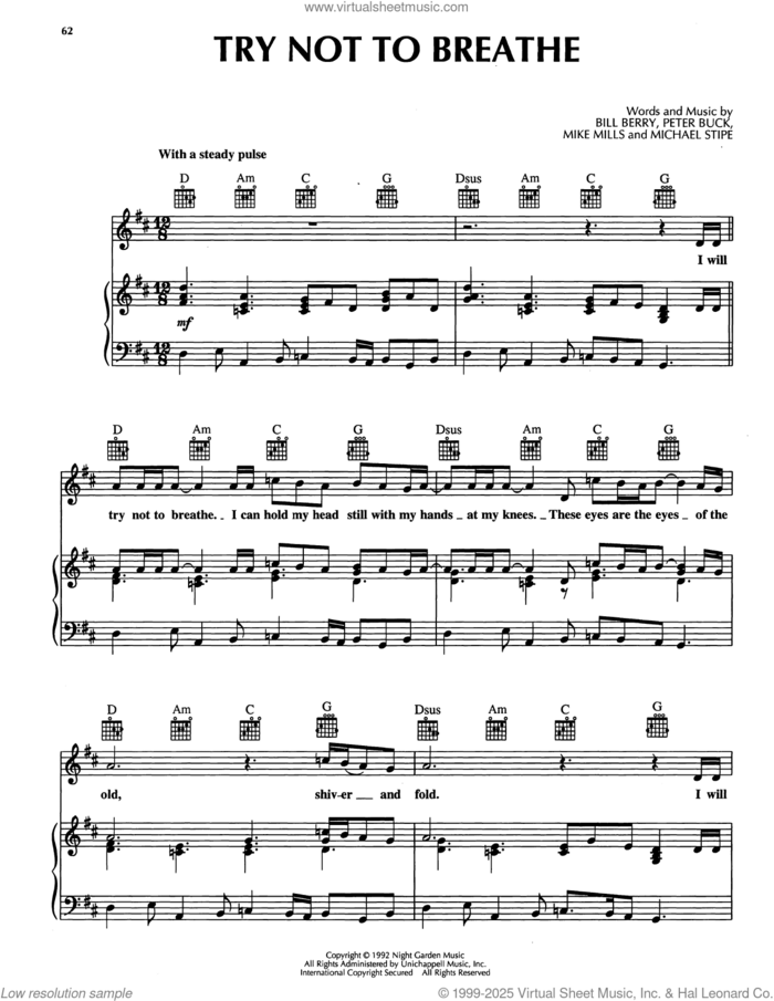 This new feature (still experimental) allows you to ask questions related to this music title to our AI music assistant (powered by OpenAI ChatGPT), trained to answer as an expert on this music title.You may ask questions like "When was this song written?" or "How would you suggest approaching this song?" You can also ask questions about the author or anything else you may think of. Just enter your queries inside the field on the top of the displayed music and click the "Ask" button on the left to start chatting. Remember that the assistant cannot perform catalog searches. It is focused only on this music title. It could also give you wrong or imperfect answers. In that case, click the "regenerate" button on the side of the answer to replace it with a new one. And, of course, you can provide feedback for each answer so we can improve the system. ![]() R.E.M.: Try Not To Breathe for voice, piano or guitar, intermediate sheet music. Includes an High-Quality PDF file to download instantly. Licensed to Virtual Sheet Music® by Hal Leonard® publishing company. NOTE: The image above is just a preview of the first page of this item. Buy this item to display, print, and enjoy the complete music. Basic Score Info