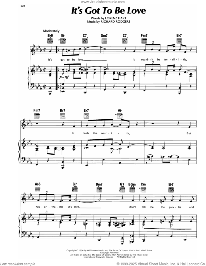 This new feature (still experimental) allows you to ask questions related to this music title to our AI music assistant (powered by OpenAI ChatGPT), trained to answer as an expert on this music title.You may ask questions like "When was this song written?" or "How would you suggest approaching this song?" You can also ask questions about the author or anything else you may think of. Just enter your queries inside the field on the top of the displayed music and click the "Ask" button on the left to start chatting. Remember that the assistant cannot perform catalog searches. It is focused only on this music title. It could also give you wrong or imperfect answers. In that case, click the "regenerate" button on the side of the answer to replace it with a new one. And, of course, you can provide feedback for each answer so we can improve the system. ![]() Lorenz Hart: It's Got To Be Love (from On Your Toes) for voice, piano or guitar, intermediate sheet music. Includes an High-Quality PDF file to download instantly. Licensed to Virtual Sheet Music® by Hal Leonard® publishing company. NOTE: The image above is just a preview of the first page of this item. Buy this item to display, print, and enjoy the complete music. Basic Score Info