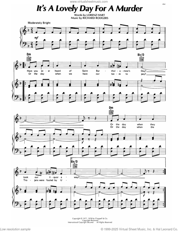 This new feature (still experimental) allows you to ask questions related to this music title to our AI music assistant (powered by OpenAI ChatGPT), trained to answer as an expert on this music title.You may ask questions like "When was this song written?" or "How would you suggest approaching this song?" You can also ask questions about the author or anything else you may think of. Just enter your queries inside the field on the top of the displayed music and click the "Ask" button on the left to start chatting. Remember that the assistant cannot perform catalog searches. It is focused only on this music title. It could also give you wrong or imperfect answers. In that case, click the "regenerate" button on the side of the answer to replace it with a new one. And, of course, you can provide feedback for each answer so we can improve the system. ![]() Lorenz Hart: It's A Lovely Day For A Murder (from Higher And Higher) for voice, piano or guitar, intermediate sheet music. Includes an High-Quality PDF file to download instantly. Licensed to Virtual Sheet Music® by Hal Leonard® publishing company. NOTE: The image above is just a preview of the first page of this item. Buy this item to display, print, and enjoy the complete music. Basic Score Info