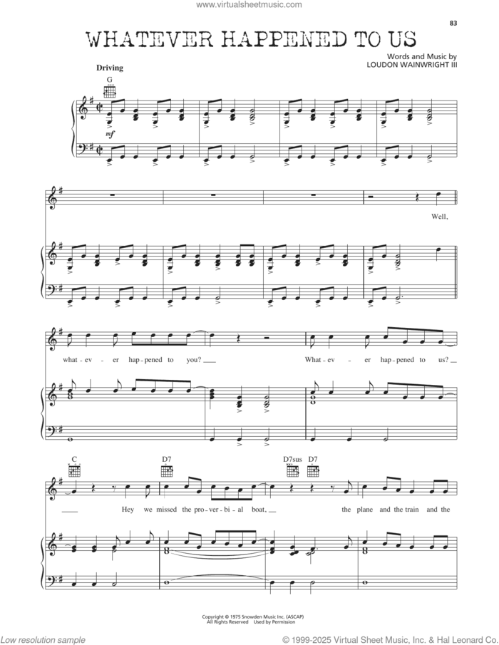 This new feature (still experimental) allows you to ask questions related to this music title to our AI music assistant (powered by OpenAI ChatGPT), trained to answer as an expert on this music title.You may ask questions like "When was this song written?" or "How would you suggest approaching this song?" You can also ask questions about the author or anything else you may think of. Just enter your queries inside the field on the top of the displayed music and click the "Ask" button on the left to start chatting. Remember that the assistant cannot perform catalog searches. It is focused only on this music title. It could also give you wrong or imperfect answers. In that case, click the "regenerate" button on the side of the answer to replace it with a new one. And, of course, you can provide feedback for each answer so we can improve the system. ![]() Loudon Wainwright III: Whatever Happened To Us for voice, piano or guitar, intermediate sheet music. Includes an High-Quality PDF file to download instantly. Licensed to Virtual Sheet Music® by Hal Leonard® publishing company. NOTE: The image above is just a preview of the first page of this item. Buy this item to display, print, and enjoy the complete music. Basic Score Info