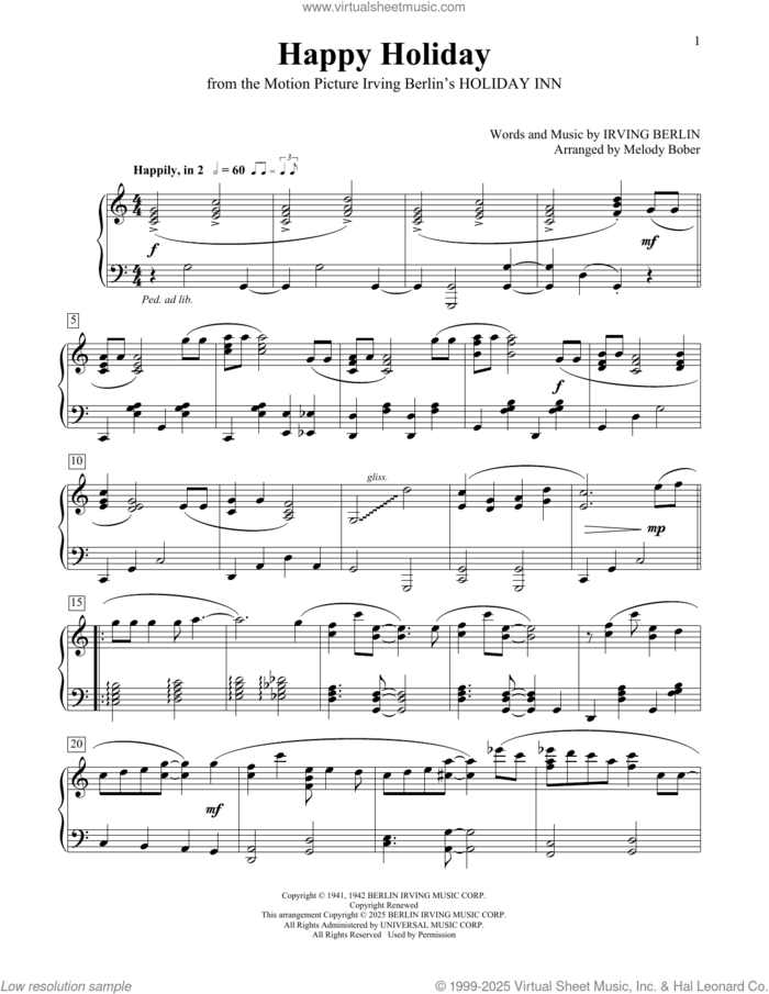 This new feature (still experimental) allows you to ask questions related to this music title to our AI music assistant (powered by OpenAI ChatGPT), trained to answer as an expert on this music title.You may ask questions like "When was this song written?" or "How would you suggest approaching this song?" You can also ask questions about the author or anything else you may think of. Just enter your queries inside the field on the top of the displayed music and click the "Ask" button on the left to start chatting. Remember that the assistant cannot perform catalog searches. It is focused only on this music title. It could also give you wrong or imperfect answers. In that case, click the "regenerate" button on the side of the answer to replace it with a new one. And, of course, you can provide feedback for each answer so we can improve the system. ![]() Irving Berlin: Happy Holiday for piano solo (elementary), beginner piano (elementary) sheet music. Includes an High-Quality PDF file to download instantly. Licensed to Virtual Sheet Music® by Hal Leonard® publishing company. NOTE: The image above is just a preview of the first page of this item. Buy this item to display, print, and enjoy the complete music. Basic Score Info