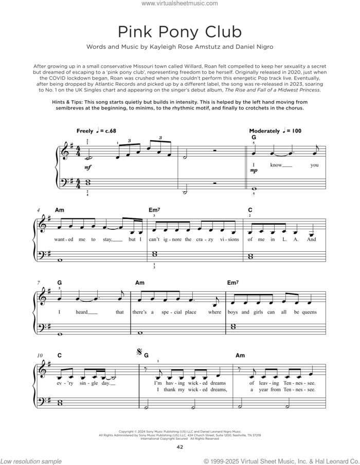 This new feature (still experimental) allows you to ask questions related to this music title to our AI music assistant (powered by OpenAI ChatGPT), trained to answer as an expert on this music title.You may ask questions like "When was this song written?" or "How would you suggest approaching this song?" You can also ask questions about the author or anything else you may think of. Just enter your queries inside the field on the top of the displayed music and click the "Ask" button on the left to start chatting. Remember that the assistant cannot perform catalog searches. It is focused only on this music title. It could also give you wrong or imperfect answers. In that case, click the "regenerate" button on the side of the answer to replace it with a new one. And, of course, you can provide feedback for each answer so we can improve the system. ![]() Chappell Roan: Pink Pony Club, (beginner) for piano solo, beginner piano sheet music. Includes an High-Quality PDF file to download instantly. Licensed to Virtual Sheet Music® by Hal Leonard® publishing company. NOTE: The image above is just a preview of the first page of this item. Buy this item to display, print, and enjoy the complete music. Basic Score Info